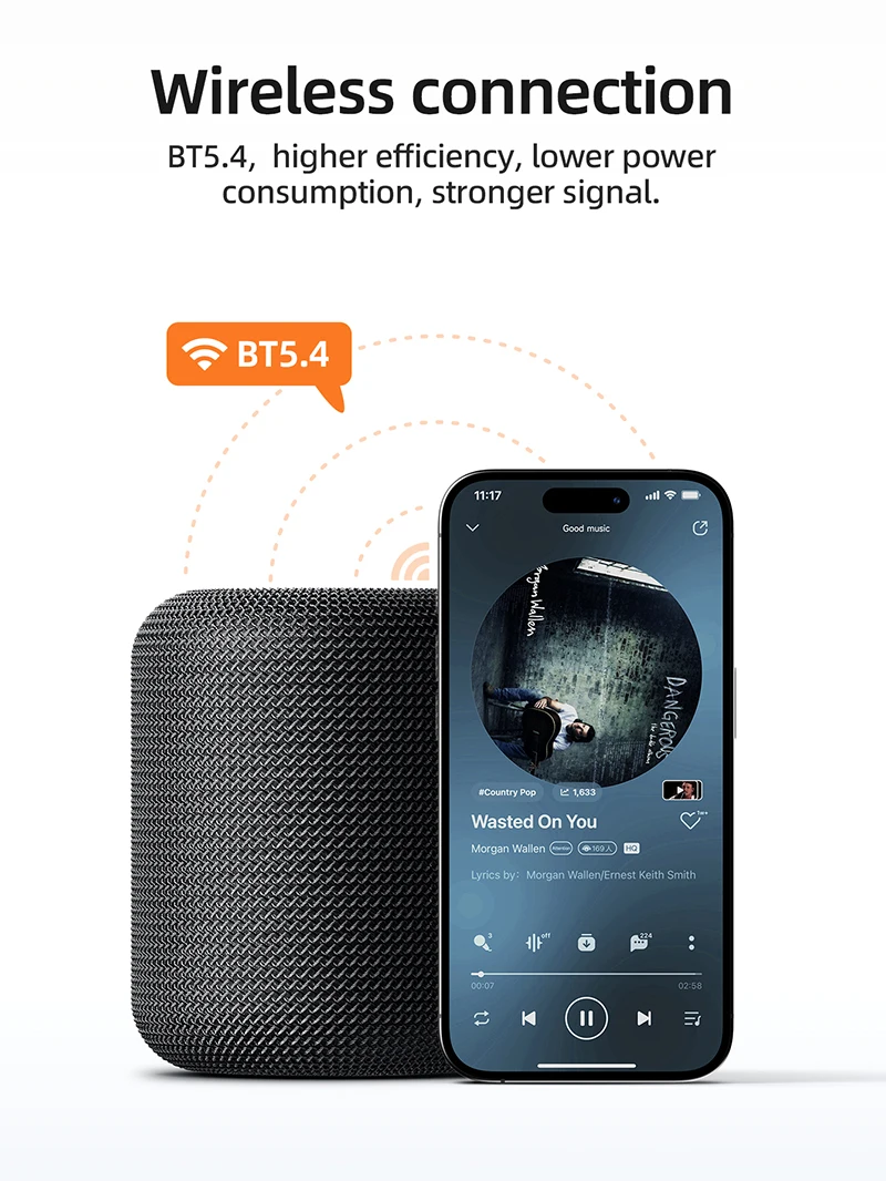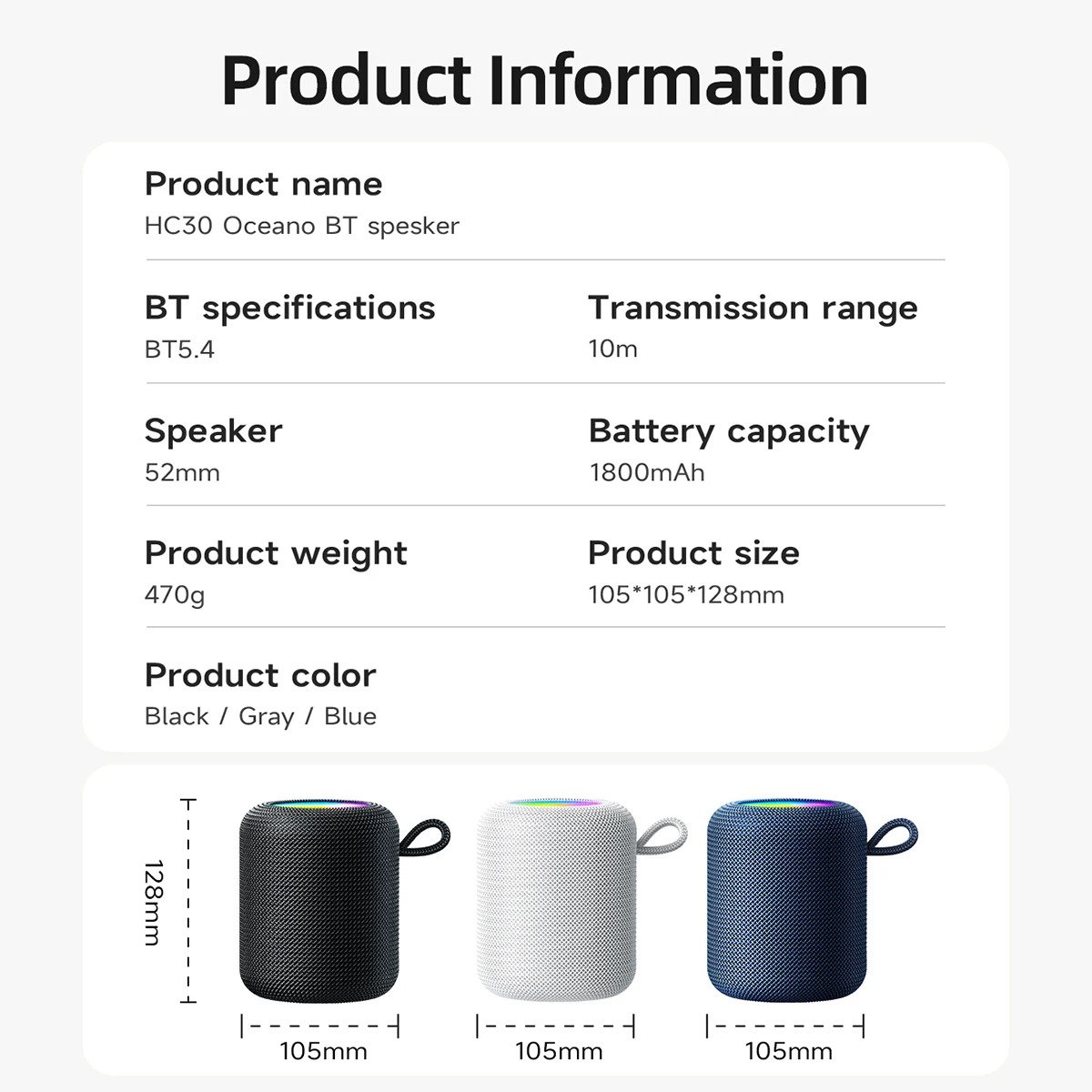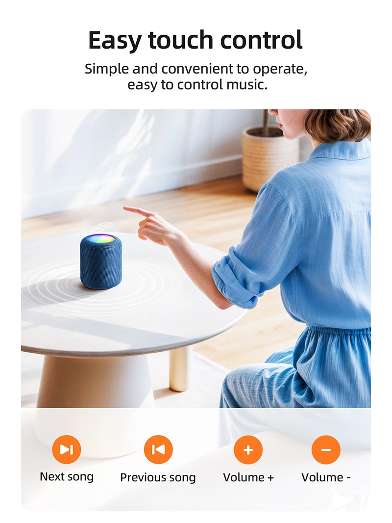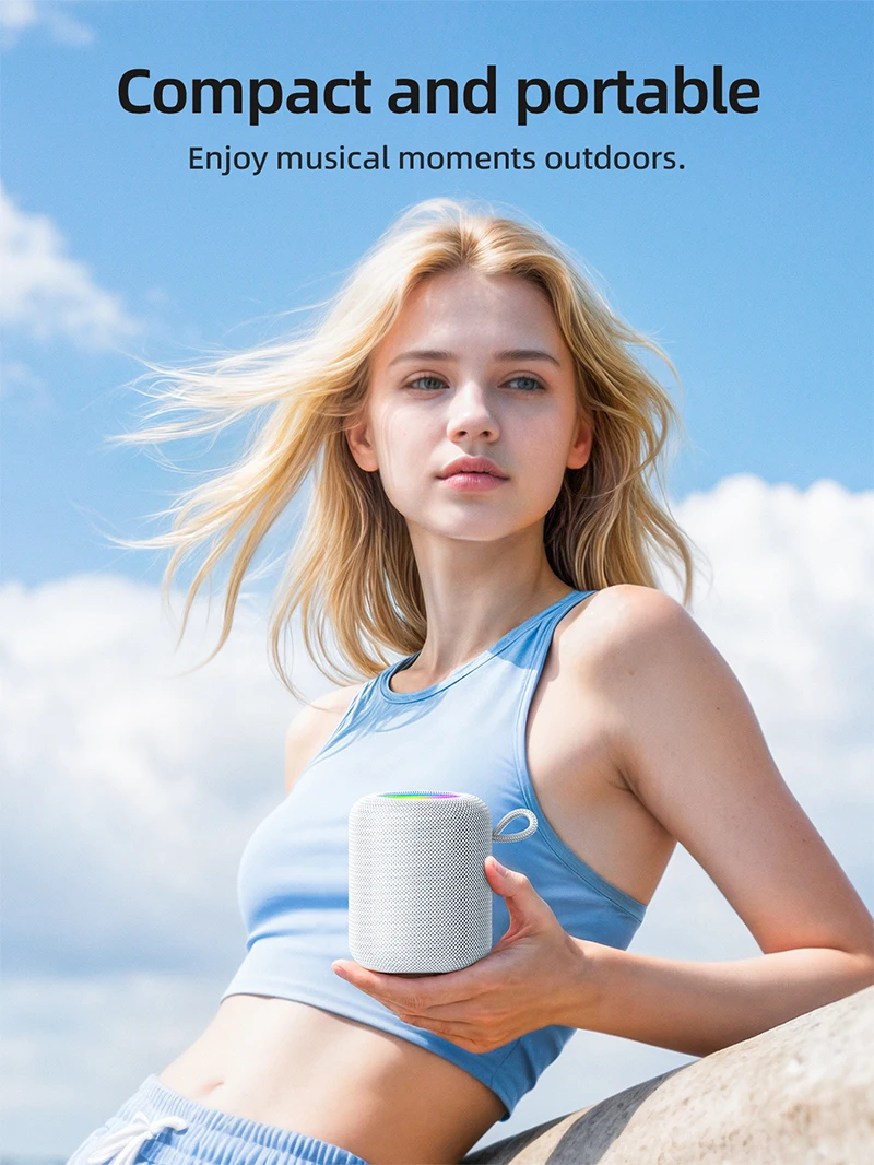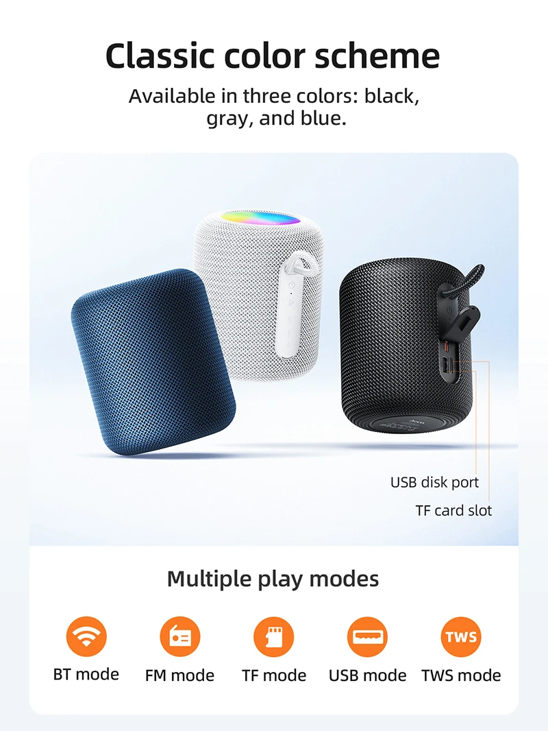 With True Wireless Stereo (TWS) pairing, enjoy true left-right channel stereo sound by connecting two HC30 units together. The built-in 1800mAh battery offers up to 5 hours of continuous play, and the modern design includes a loop strap for easy carrying.